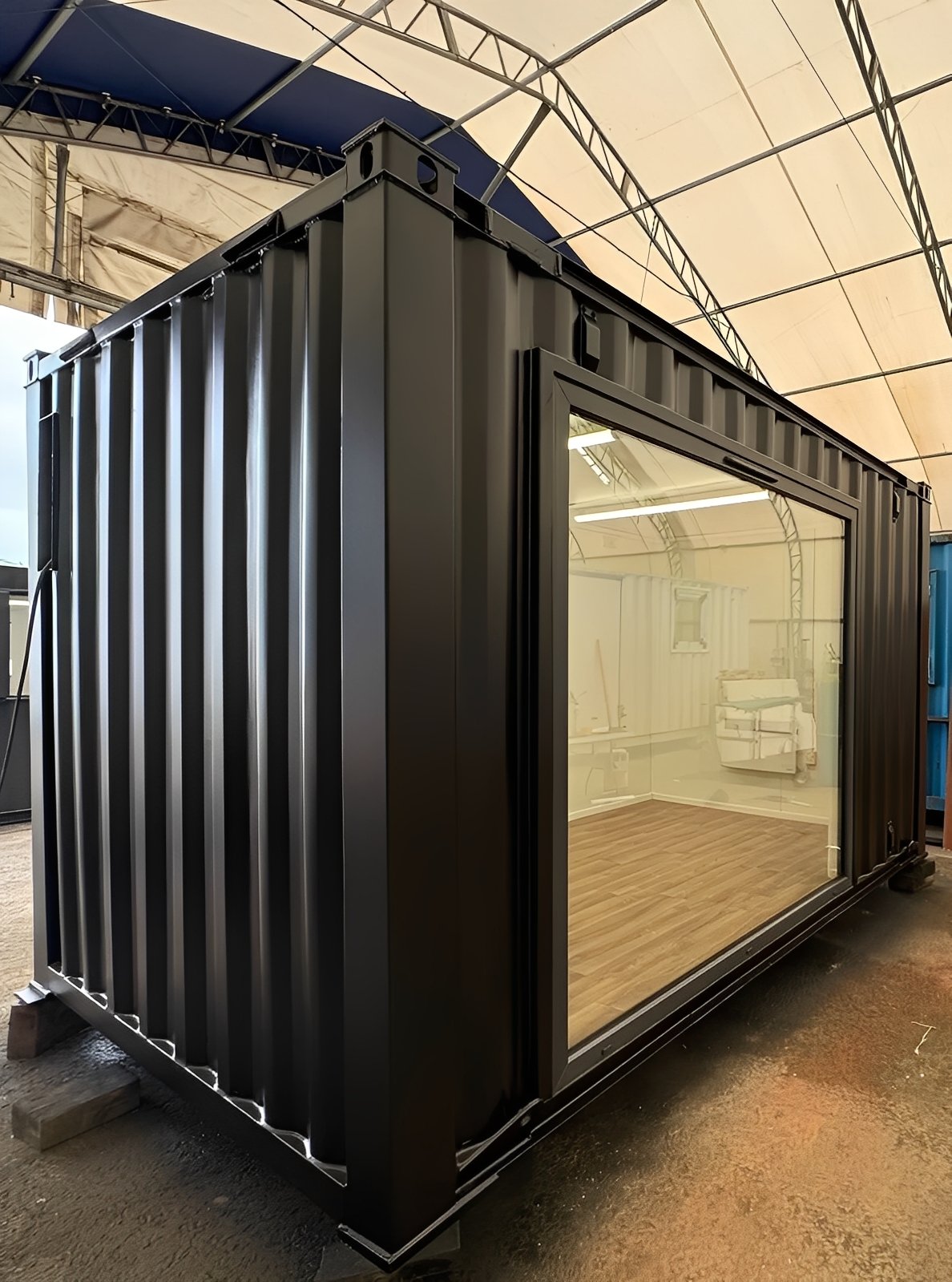 Built from durable corrugated steel and finished in Jet Black, this open-plan cabin combines strength, style, and functionality — ideal for both professional and residential environments.